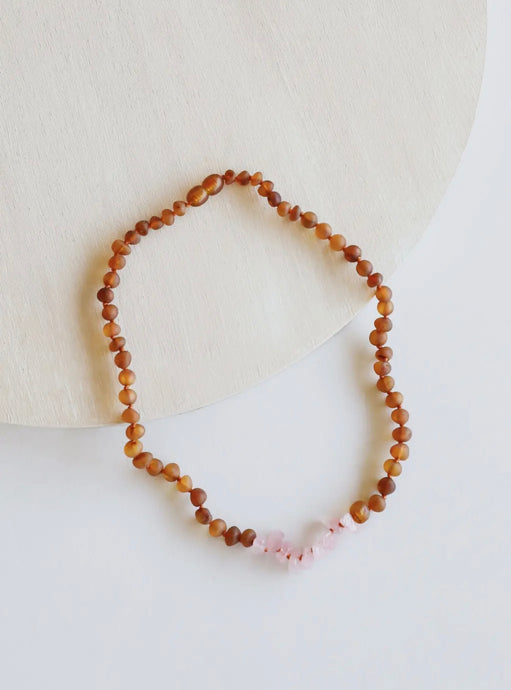 Raw Cognac Baltic Amber + Raw Rose Quartz Baby Necklace