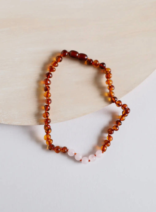 Polished Cognac Baltic Amber + Rose Quartz Baby Necklace