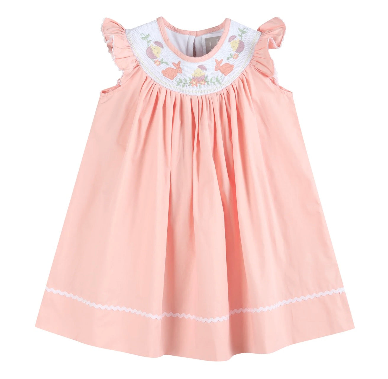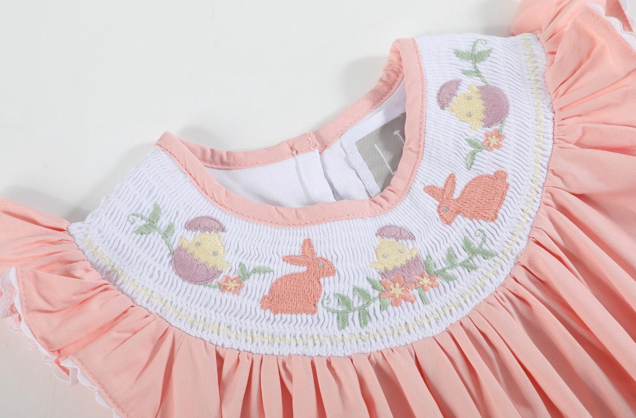 This adorable Light Pink Easter Smocked Bishop Dress is a must-have for your little girls spring wardrobe! Crafted from soft, breathable light pink cotton, it features intricate smocking at the neckline adorned with charming embroidered bunnies, chicks and flowers. Perfect for Easter celebrations, family photos, or spring outings, this dress with have her looking “egg”-star cute and “hop”-ing with joy all season!